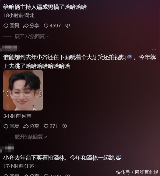 这种群星细致无比的期间,民众舞台上、舞台下的阐明就非常值得细看了。 尤其是湖南台的主捏东说念主们,此次亦然大出锋头了。
